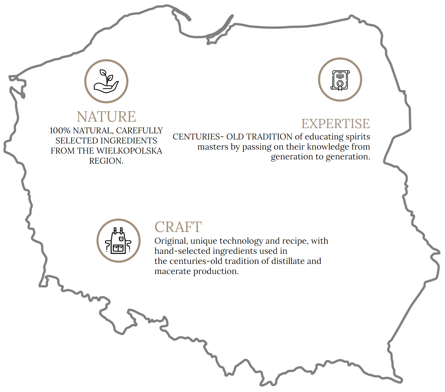 The tradition of vodka production in Poland dates back to the 15th century. Our vodka is produced in small batches with selected polish grain. Each stage of the handmade production process is strictly monitored.